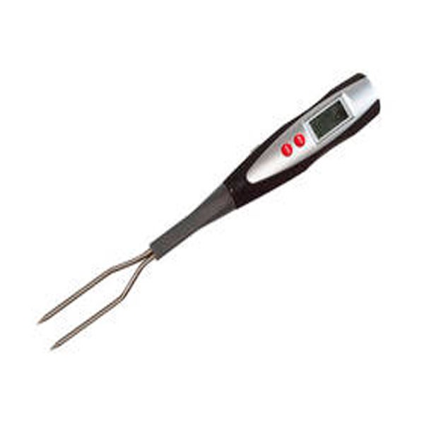 Tenerdor barbacoa con termómetro; mango de plástico , 2 botones rojos de control, display LCD (ºC yºF)