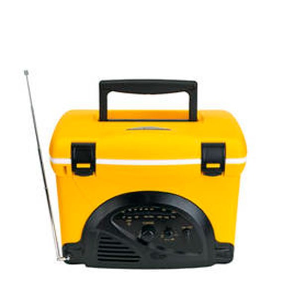 Nevera con radio, conexión para auriculares, adaptador y asa, capacidad aproximada 4 litros.