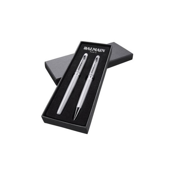 Conjunto de alta calidad compuesto por bolígrafo y roller presentado en caja de regalo Balmain en el mismo color.